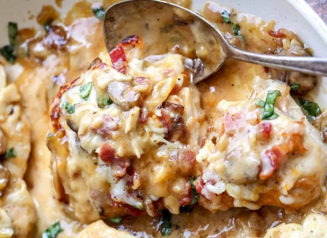 Фарширована курка з беконом, грибами та сиром, багато сиру. Посипана великою кількістю бекону та грибів, збризканий найпростішим і найсмачнішим домашнім медово-гірчичним соусом, потім запечена до досконалості – це райське поєднання.