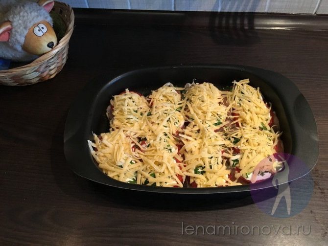 Посипаю кожен шматочок сирною крихтою: наче сніг припорошив сопки. Мені подобається мій витвір — навіть у такому вигляді блюдо виглядає апетитно.