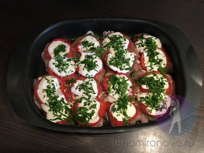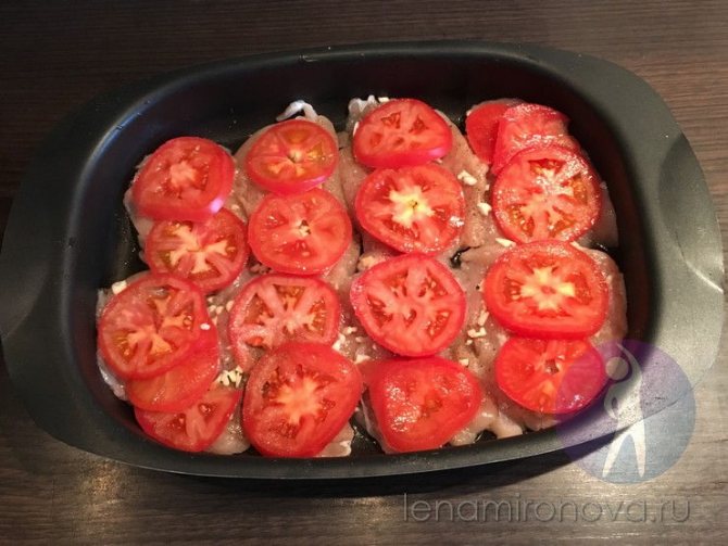 Викладаю на філе помідори: в середньому по 2-3 кружки на кожен порційний шматок. Томати – це чудовий маринад. Вони містять аскорбінову кислоту або вітамін С, який прямо в лотку під час приготування підмаринує м’ясо птиці і зробить його м’якшим і соковитішим.