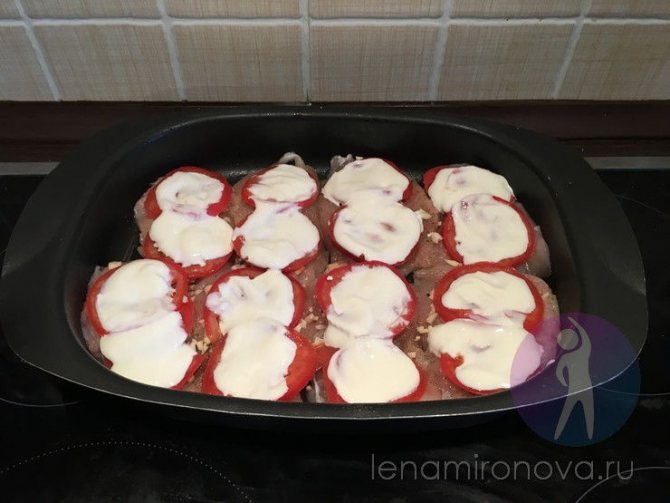 Подрібнений часник змішуємо з майонезом і цим соусом змащуємо відбивні. Зверху кожен шматочок посипаємо тонко нарізаною цибулею. Помідори нарізаємо кружальцями і викладаємо по 2-3 кружки помідора на відбивні. Посипаємо помідори сіллю та перцем.