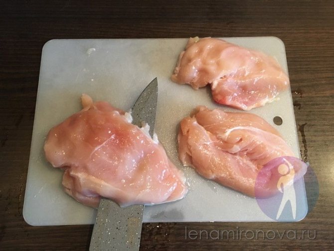 - З курячої грудки видалити шкірку, плівки та зайвий жир. М’ясо промити, просушити паперовим рушником і нарізати поперек волокон на шматочки до 2 см завтовшки. За бажанням можете запекти м’ясо стейками.