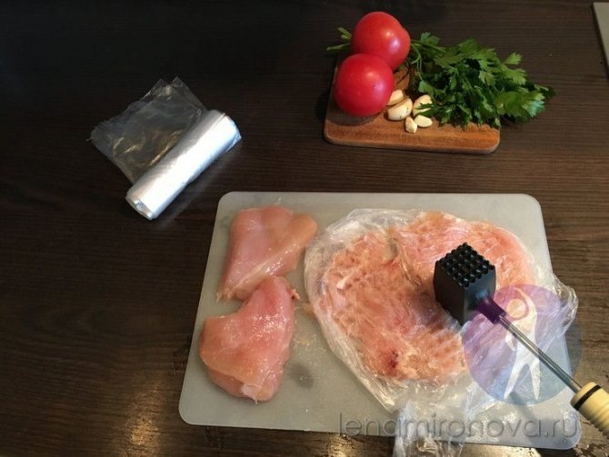 Щоб відбити шматки курки молотком, я використовую звичайні поліетиленові пакетики для сніданку. Поміщаю по два шматки філе в пакет і відбиваю молотком для м’яса. Бризки не летять, молоток і обробна дошка менше брудняться.