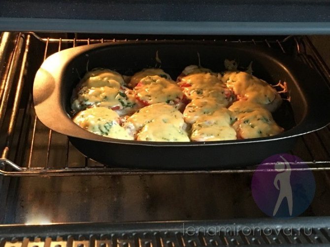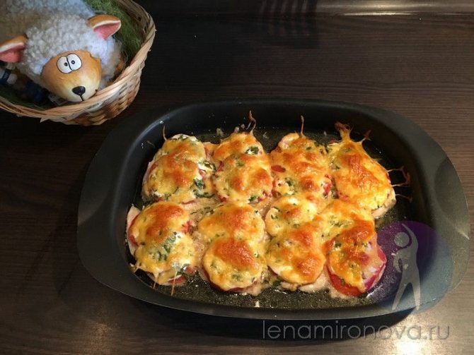 Через 20 хвилин запікання при 180 градусах моя страва виглядала так, як на фото: сир розплавився, всі шматочки рівні, виглядають уже готовими. Тонкі шматки м’яса птиці за 20 хвилин повинні пропікатися.