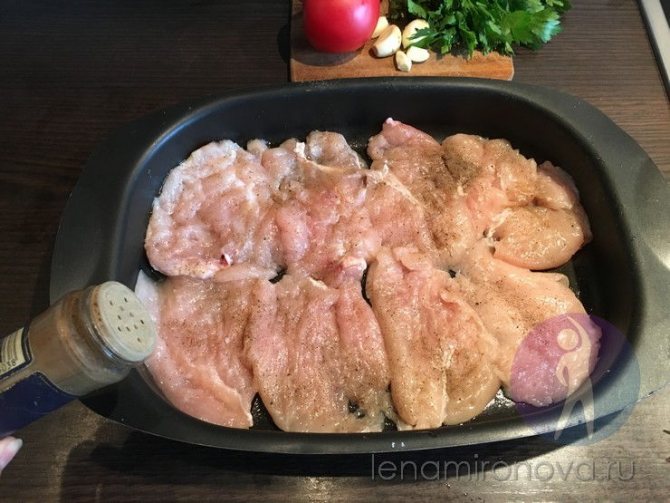 Куряче філе нарізаємо пластинками і акуратно відбиваємо, намагаючись не пошкодити волокна. Посипаємо відбивні сіллю та перцем. Змащуємо олією форму для запікання або деко з високими бортиками. Викладаємо відбивні, розташовуючи їх впритул один до одного.