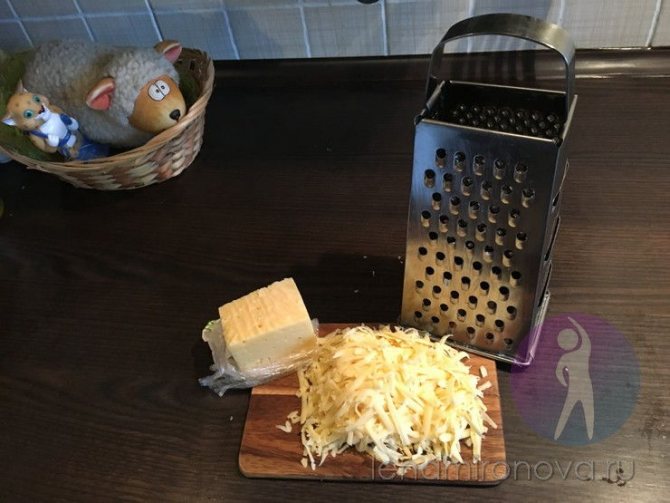 Залишився останній інгредієнт – сир. Натираю його на велику тертку. Я його зважила: на 2 філе досить 100 грам. Сир можна натирати на терку будь-якого розміру, він все одно розплавиться.