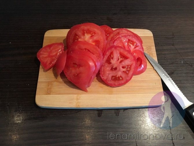 Нарізаю кружальцями 2 помідори. Ніж взяла інший, таким ножем із зубчиками легко прорізається навіть щільна шкірка та не бризкає томатний сік.