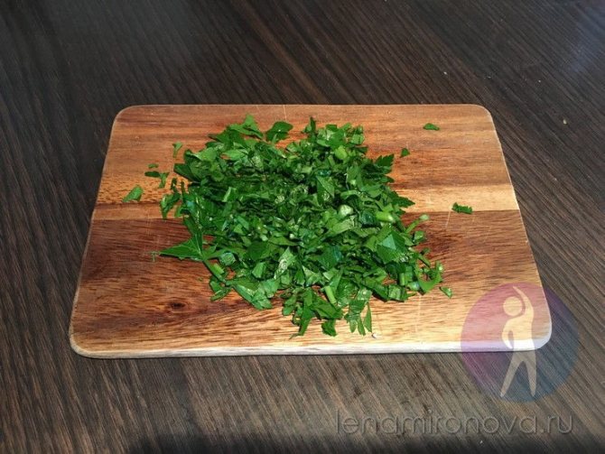 Дрібно нарізаю зелень – петрушку. Делю на 2 частини: перша піде на шар сметани, а другу частину я використовую під час подачі готової курячої грудки.