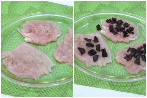 - Помиємо чорнослив, якщо в ньому є кісточки, приберемо їх. Наріжемо ягоди на середні скибочки, покриємо ними м’ясо. При необхідності вимочимо чорнослив хвилин 10 до м’якості у теплій воді;
