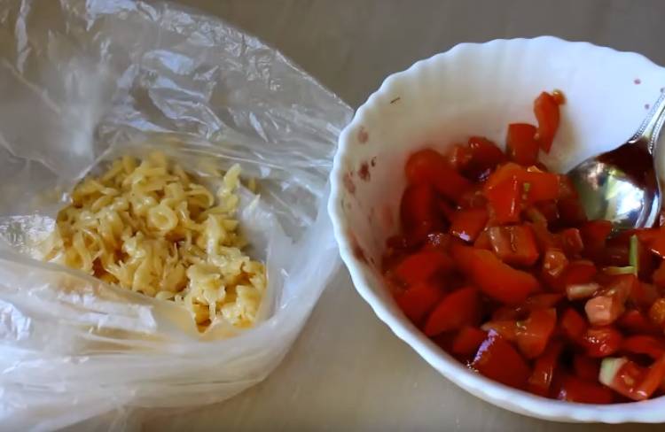Обсмажуємо із двох сторін. Вогонь має бути середнім, щоб свинина не згоріла. Тим часом натираємо твердий сир. Нарізаємо кубиками помідори. Переміщуємо в миску та солимо. Помідори пускають сік. Сік нам не потрібен, а лише м’якоть.