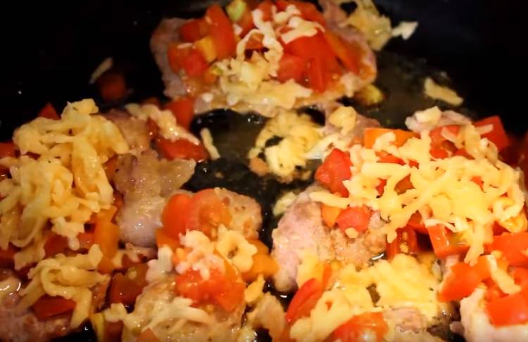 Викладаємо на м’ясо помідори і гасимо 7 хвилин під кришкою. Потім викладаємо твердий сир. Накриваємо кришкою, і гасимо пару хвилин.