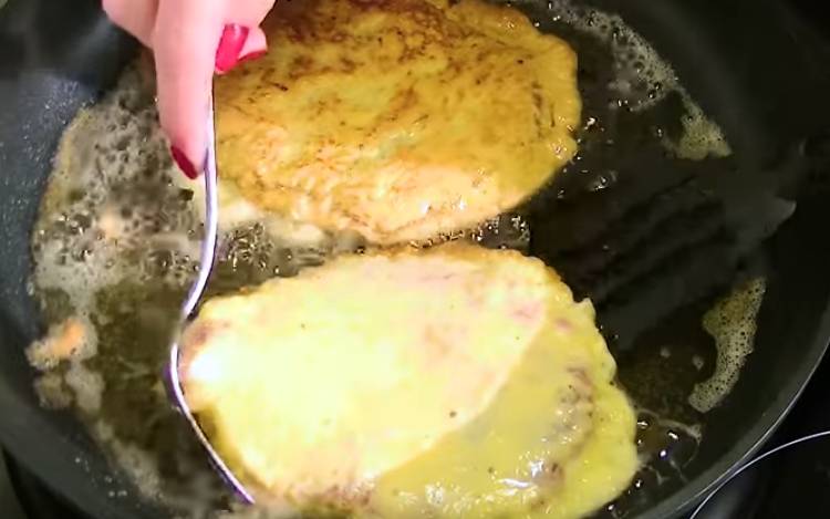 На сковороді розігрівається масло, якого не повинно бути дуже мало. Підготувати для смаження тарілочку зі збитим яйцем і сухарями, потім послідовно вмочувати в тому самому порядку, в якому перераховано.