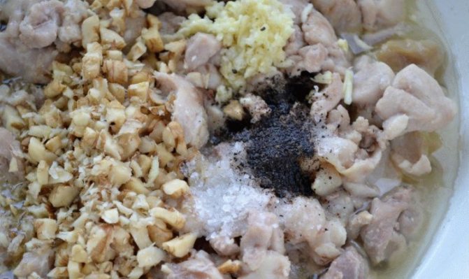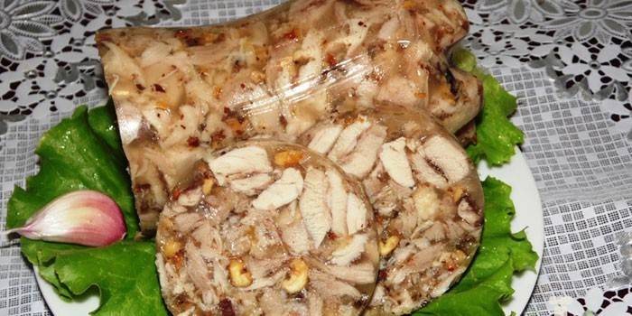 - Додай до м’яса горіхи і пропущений через прес часник, підкоригуй смак, додавши солі та спецій, влий бульйон з желатином. Залиш остуджуватися.