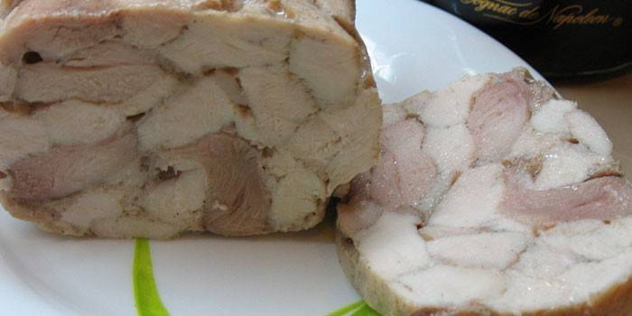 Тушку ділять на шматки та занурюють у підсолену воду, щоб вона зварилася. Потім м’ясо виймають, дістають із нього кістки і ріжуть кубиками. Ці кубики слід покласти на чисту сковороду і підсушити. Желатин розводять у теплій воді, добиваючись повного розчинення. Після цього додають його до бульйону.