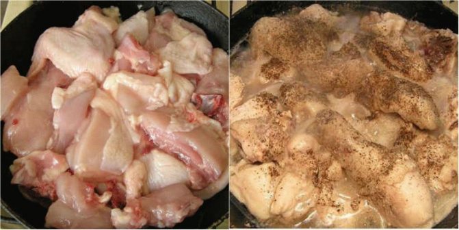 - Куряче м’ясо наріж шматочками середнього розміру, склади в чавунок або товстостінну сковороду. Не додаючи жодної олії, накривши кришкою, на слабкому вогні почни гасити курку у власному соку. Злегка посоли та поперчи. Процес гасіння триватиме 35-45 хвилин.