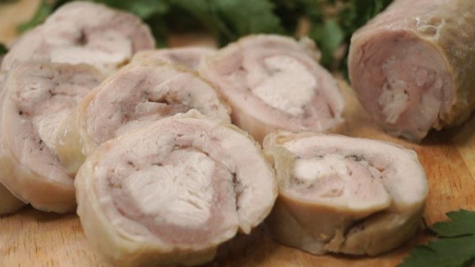- Так як м’ясо курки на смак не надто яскраве, то в процесі варіння рекомендуємо додавати сіль, інші приправи (наприклад, лавровий лист, запашний перець) та овочі (цибуля та морква). Якщо просто зварити «порожнє» м’ясо, то рулет буде пріснуватий і нудним.