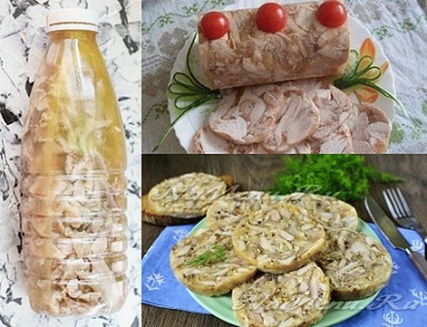Прекрасною заміною магазинного продукту стане куряча ковбаса в пляшці. Натуральний м’ясний рулет, що не містить барвників, підсилювачів смаку і консервантів обійдеться дешевше, при цьому вийде набагато смачніше і корисніше покупної ковбаси. Застигання домашньої закуски відбувається за рахунок желатину або кісткового відвару (як для холодця). Як приготувати курячий рулет за допомогою пляшки?