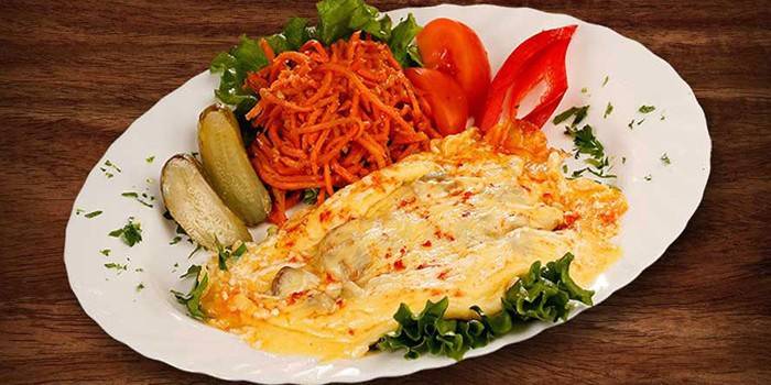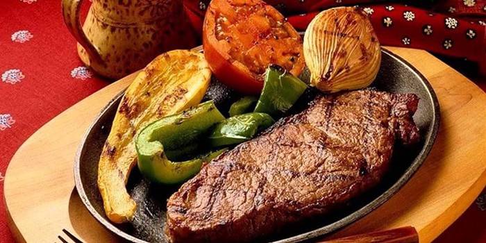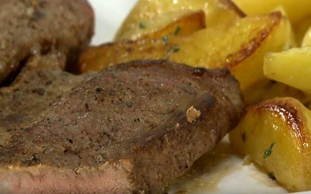 Інгредієнти : яловичина (вирізка) (600г), сало топлене (30 грам), м’ясний сік (1 склянка), гарнір (500 грам), чорний мелений перець, зелень, сіль.