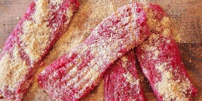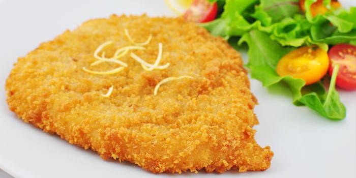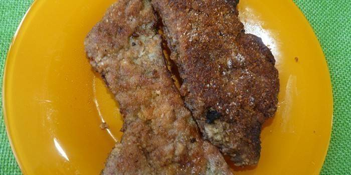 - М’ясо посолити та поперчити. Обваляти в паніровці.