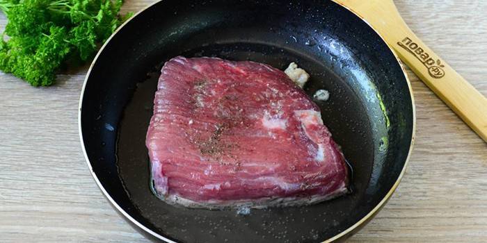 - У розпечену сковорідку викласти жир. Посмажити на ньому м’ясо по обидва боки (приблизно по 3 хвилини).