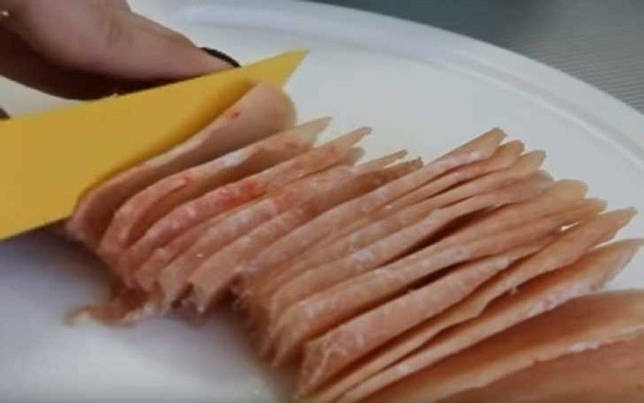 - кожен із нарізаних шматочків відбивається молоточком. При цьому молоточок має бути змочений у воді;