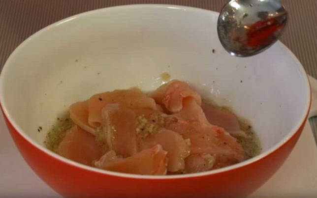 - Порізати індичку на язички. Відбити, накривши харчовою плівкою. Натерти спеціями та приправами.