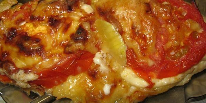 - Зверху викласти цибулю кільцями, посипати тертим сиром.