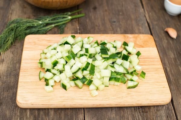 2. Далее огурец нужно разрезать вдоль на 2 части, удалить с помощью ложки семена и мягкую часть и порезать на мелкие кубики или тонкие пластины. Петрушку с укропом также потребуется мелко порубить.