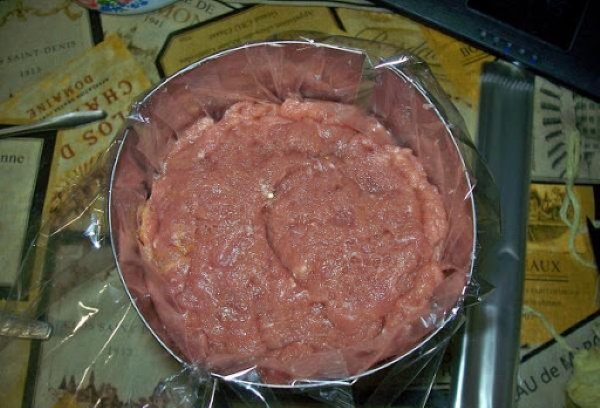 - М’ясо готують, видаляючи жили, сміття. Перекручують його за допомогою побутової м’ясорубки кілька разів. Востаннє яловичину прокручують разом із салом. Якщо є потужний блендер, його можна використовувати для отримання яловичини рідкої м’ясної емульсії.