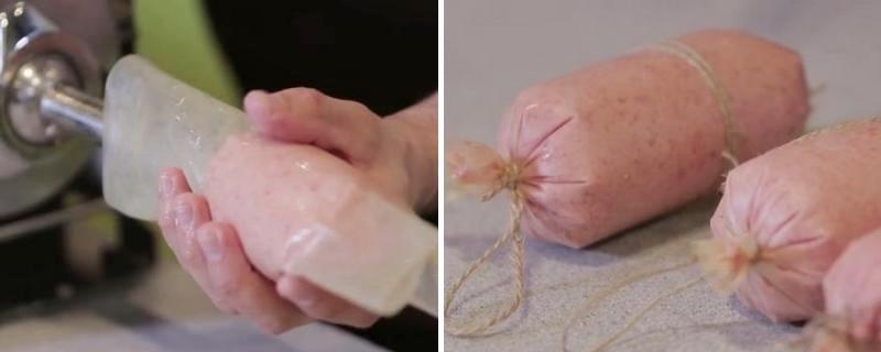 - За допомогою спеціального шприца фаршем заповнюють колагенову оболонку. З двох боків кінці батона перев’язують ковбасним шпагатом. Важливо під час заповнення оболонки або кишки м’ясом не допустити повітряних бульбашок. Вони можуть стати причиною того, що оболонка під час варіння лопатиметься в місцях скупчення повітря.