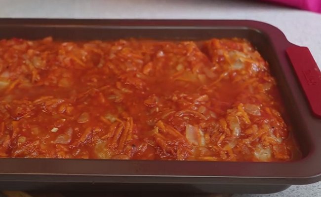 Ліниві голубці з капустою та фаршем у духовці в томатно-сметанному соусі