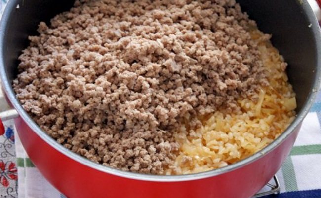 8. Викладаємо перекручене м’ясо в каструлю з овочами. Ось тепер ретельно все перемішуємо. Залишаємо гасити ще близько 10 хвилин. Перевіряємо за рівнем готовності рису. Якщо крупа ще тверда, необхідно долити трохи води та протушкувати.