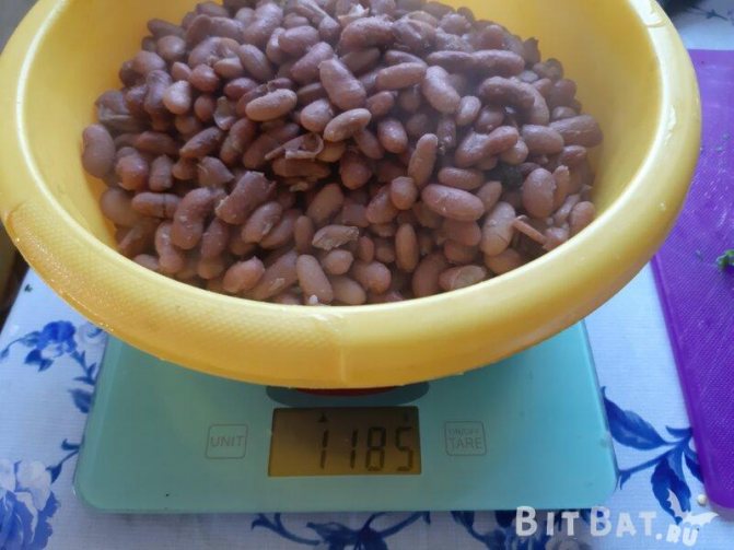 12. В миску засыпаем фасоль и смотрим значения. По фото видно, что у меня получилось 1 кг. 185 гр. Значит из расчёта высчитываем, что соли нужно 11 гр. + 1 -2 гр. на жидкость от бульона и того 13 гр. соли необходимое количество.