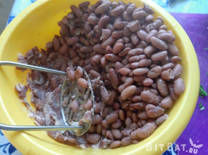 14. Слегка измельчаем фасоль (20% от всей массы) с помощью толкушки. Так наш салат приобретёт красивый вид. Перемешиваем лобио.