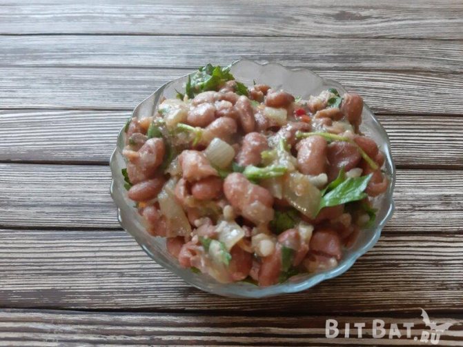 9. Фасоль сварилась, вычерпайте с неё жидкости 150-200 гр. она нам пригодится, чтобы салат не получился сухой.