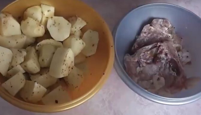 1. М’ясо миємо та підсушуємо паперовим рушником. Картоплю чистимо, миємо і крупно нарізаємо (одну картоплину достатньо розділити на 4 частини). Потім наливаємо по парі столових ложок рослинної олії в миску з картоплею та м’ясом. Додаємо сіль, перець та спеції та ретельно все перемішуємо.
