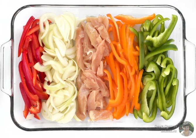 Перець болгарський ретельно промиваємо, очищаємо від насіння та нарізаємо кубиками. Потім відправляємо заготовку до миски. Перемикаємось на м’ясо – видаляємо кісточки, хрящики та шкірку, а саму курятину нарізаємо на невеликі шматочки. Відправляємо м’ясо до перцю та заливаємо все це газуванням. Сюди ж додаємо трохи рослинної олії та соусу соєвого. Солимо і перчимо масу, а також додаємо паприку. Все це ретельно перемішуємо та відставляємо убік. Хай маринується.