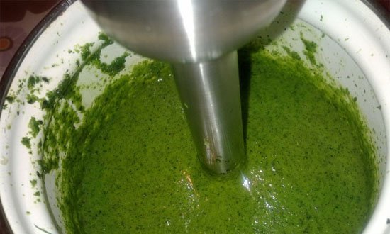 2. Часник разом із зеленню перемолоти на блендері і змішати із олією до стану однорідного соусу. Посолити, поперчити.