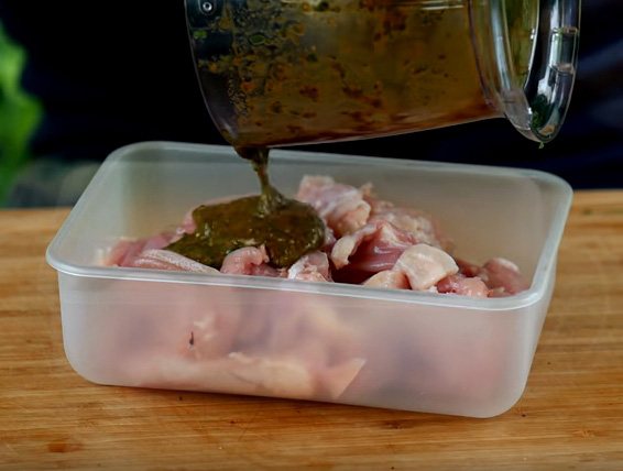 3. Залити отриманою сумішшю курку, добре перемішати, щоб зелений маринад повністю покрив усі шматочки, дати настоятися в холодильнику близько 2-х годин.