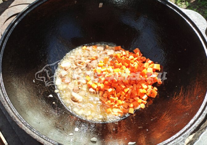 І буквально за хвилини 3-4 додаємо в казан моркву. Нагадую, вогонь під казанів весь час максимальний, всі овочі повинні просочитися соками і добре обсмажиться.