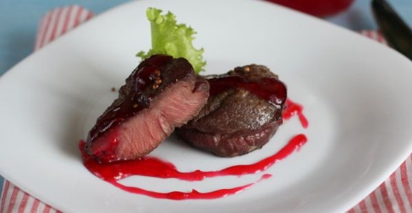 Медальйони з яловичини приготувати ніжними, м’якими, з оригінальним смаком можна, використовуючи брусницю. З ягід вийде незвичайний соус. Брусниця підійде як свіжа, і консервована. Другий варіант простіше використовувати у процесі. Калорійність такого частування виходить приблизно 178,4 ккал на 100 г.