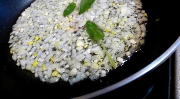 - На жирі, що залишився, в ємності обсмажуватиметься дрібнорублена цибуля з шавлією. Достатньо виявиться кілька хвилин приготування.