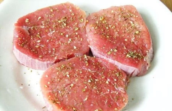 - М’ясну вирізку слід промити, висушити, нарізати медальйонами середнього розміру. Після – натерти сіллю. Можна використовувати на цьому етапі перець будь-якого кольору.
