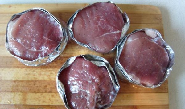 - Щоб заготовки мали гарну акуратну форму, варто використовувати фольгу. Її відрізки згортаються кілька разів у вигляді довгих щільних смужок, після чого обертаються навколо медальйонів з яловичини. Щоб надійно зафіксувати форму, слід закручувати смужки джгутами.
