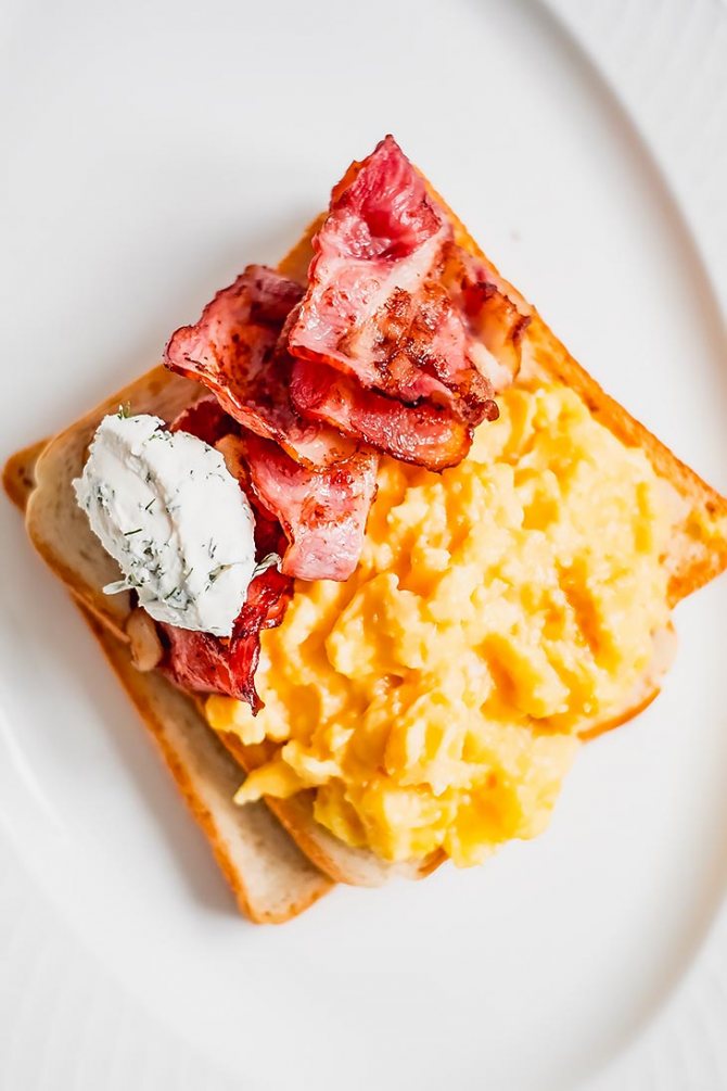 - Мягкий, воздушный и слегка мокрый скрамбл выложить на тост с поджаренным беконом.
