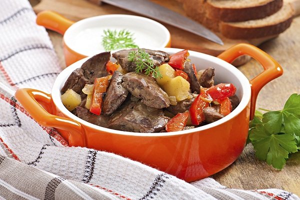 Когда говяжью печенку тушат в сметанном соусе с добавлением овощей, исчезает явный «печеночный привкус». Субпродукты пропитываются смесью овощных соков и просто преображаются, приближаясь по вкусу к обычному мясу. Классический вариант обеда предполагает подачу готового блюда с отварным картофелем или тонкими спагетти.