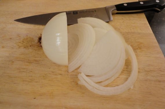 Цибулини почистіть від лушпиння, промийте. Сполосніть ніж холодною водою і розріжте їм кожну цибулину навпіл, а потім накришіть півкільцями. Шматочки цибулі також помістіть у холодну воду і поставте вбік.