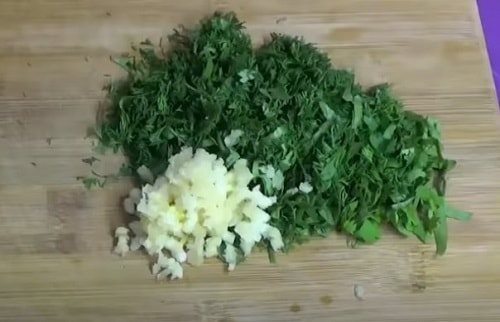 Порубите зелень, измельчите в крошку чеснок.