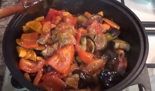 9. Все хорошо перемешиваем. Готовим на огне «ниже среднего» под крышкой. Вливаем совсем чуточку воды, если сока овощей и мяса недостаточно. Тушим примерно час-полтора.