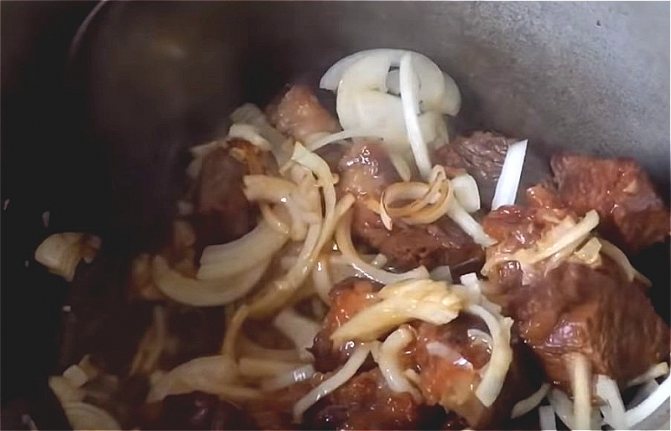 Нарежьте луковицы четвертинками колец, отправьте к мясу. Первые несколько минут готовьте на полном огне. Затем сбавьте до умеренного.