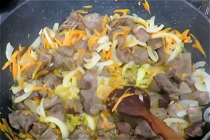 Говядина тушеная с луком и морковью на сковороде